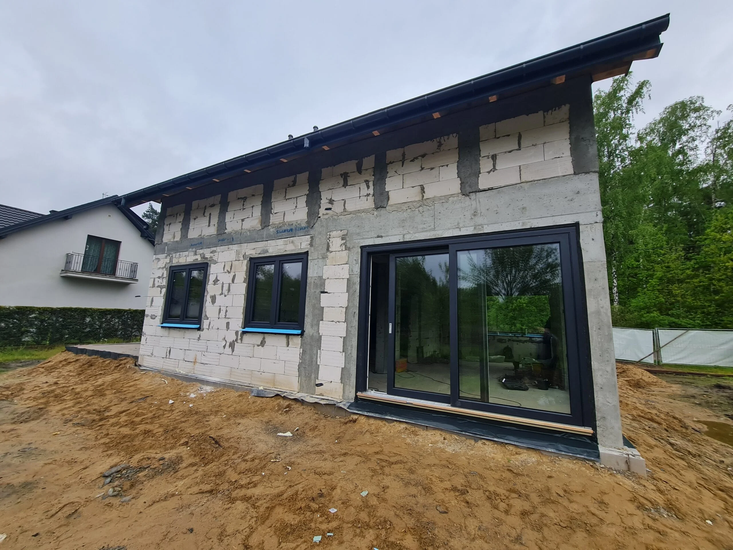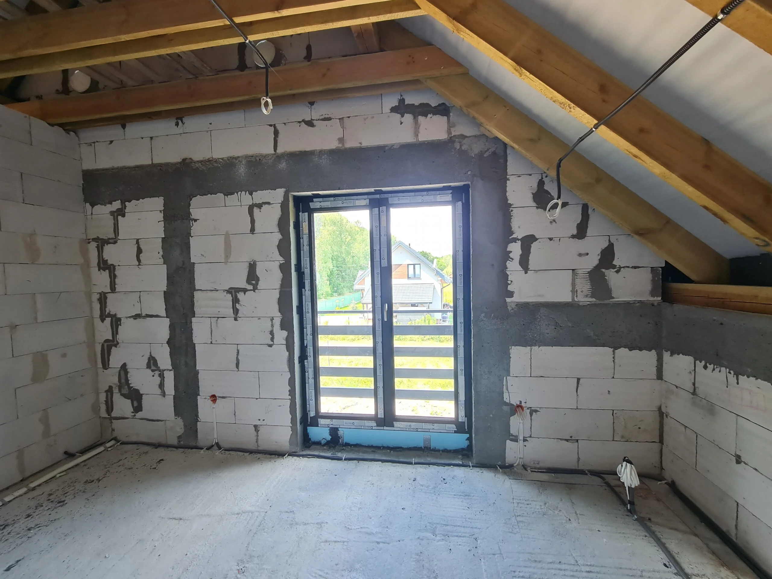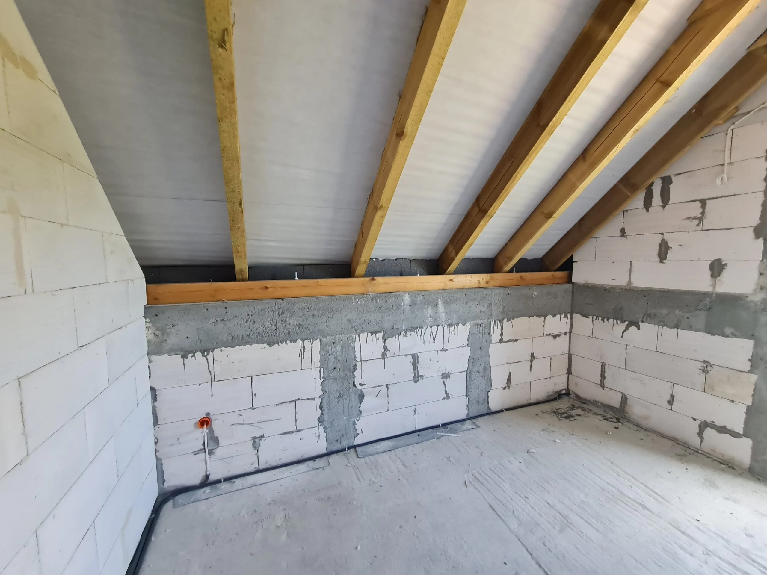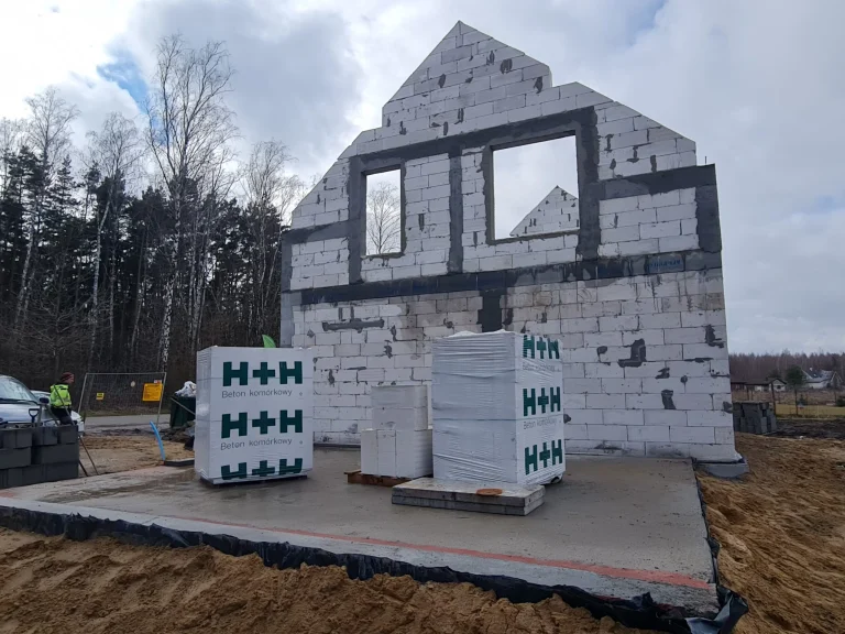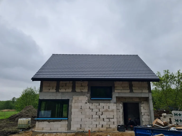 Nach Durchführung der notwendigen Vorarbeiten wurde eine 15 cm starke bewehrte Fundamentplatte mit einer 15 cm starken energiesparenden Styrodurdämmung hergestellt. Die tragenden und die Trennwände des Gebäudes wurden aus Porenbeton gebaut. Teriva 24 Decke. Der Dachstuhl wurde auf traditionelle Weise hergestellt und das Dach mit flachen Betonziegeln in Graphitfarbe gedeckt.