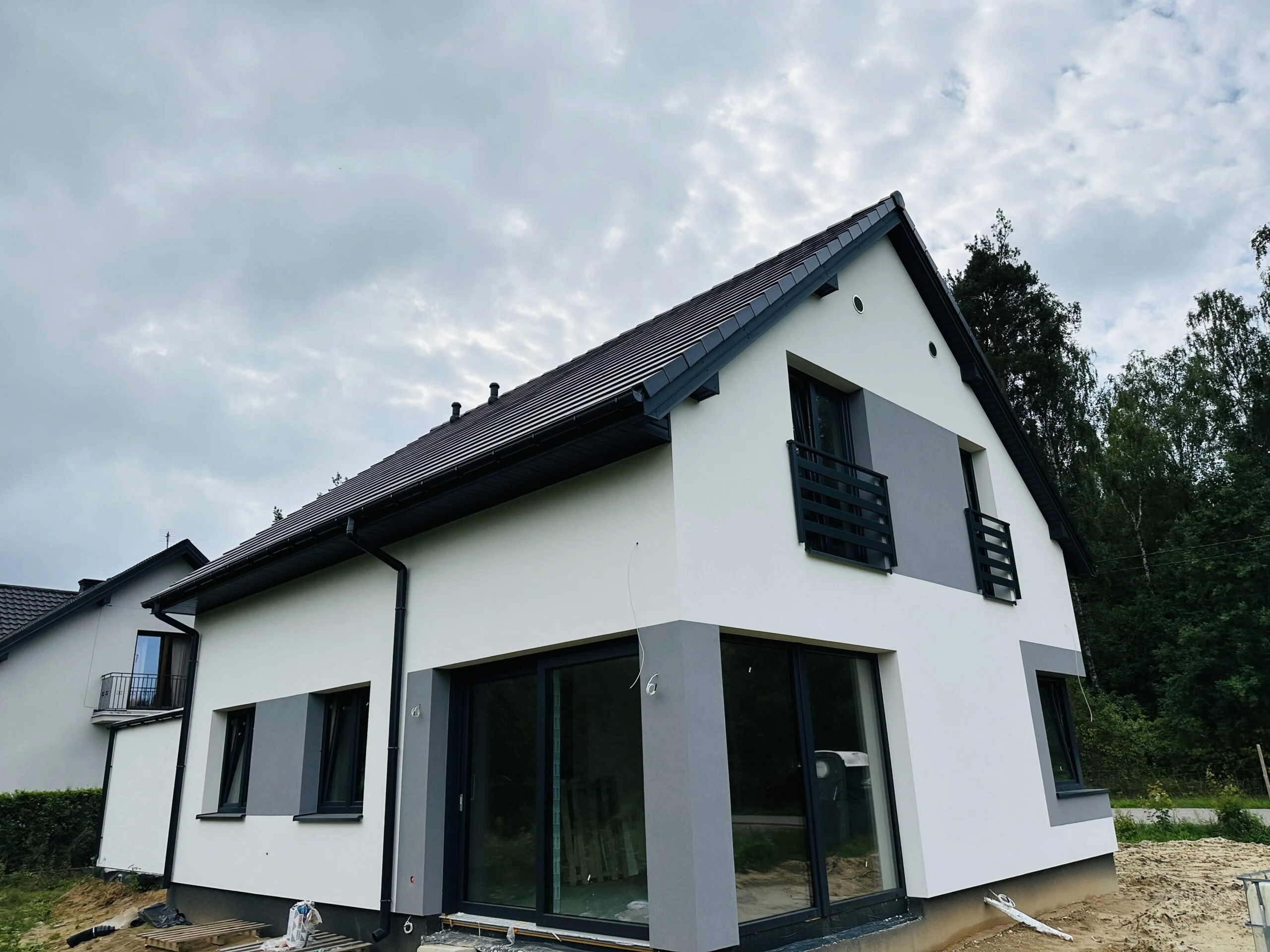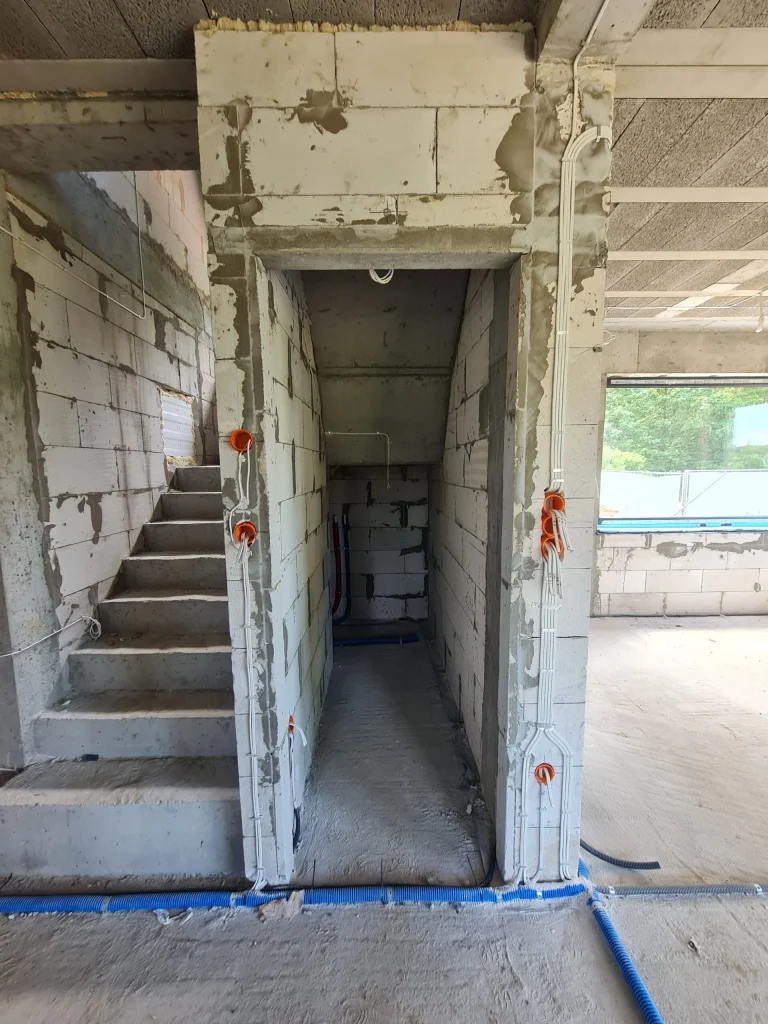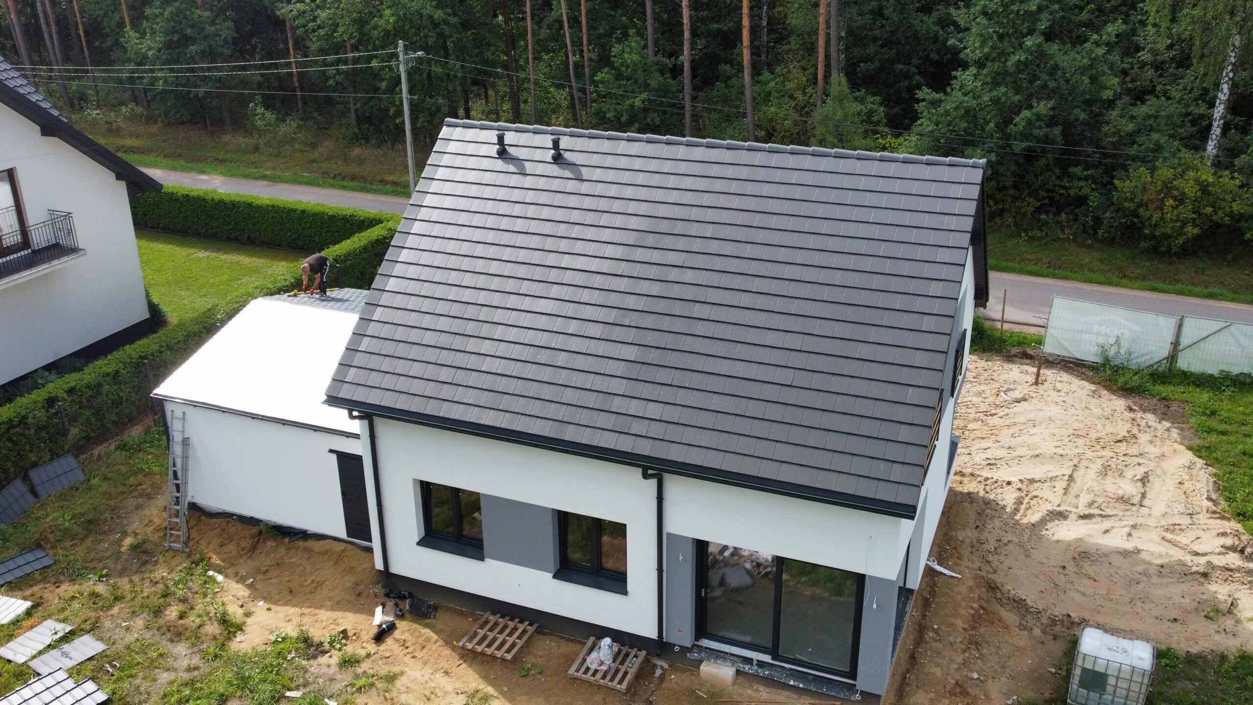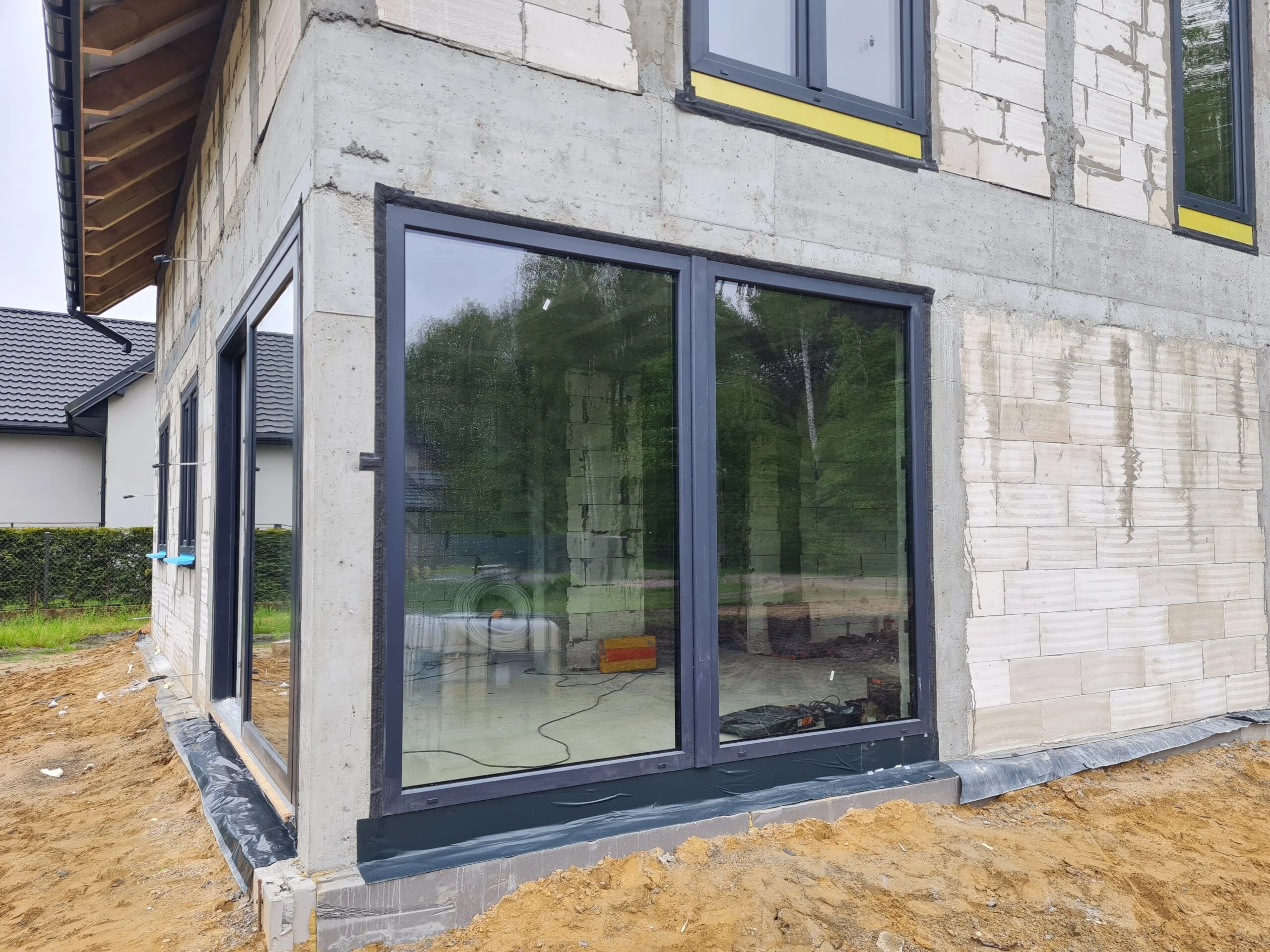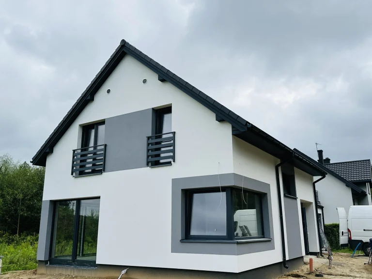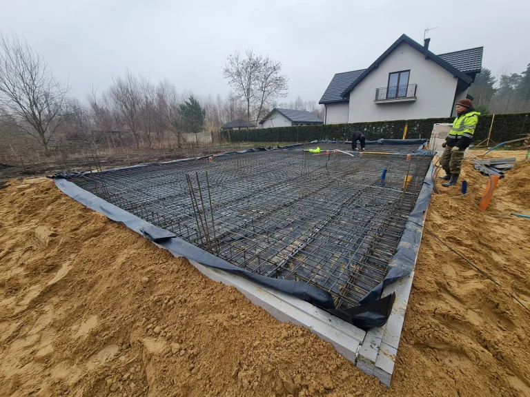 Nach Durchführung der notwendigen Vorarbeiten wurde eine 15 cm starke bewehrte Fundamentplatte mit einer 15 cm starken energiesparenden Styrodurdämmung hergestellt. Die tragenden und die Trennwände des Gebäudes wurden aus Porenbeton gebaut. Teriva 24 Decke. Der Dachstuhl wurde auf traditionelle Weise hergestellt und das Dach mit flachen Betonziegeln in Graphitfarbe gedeckt.