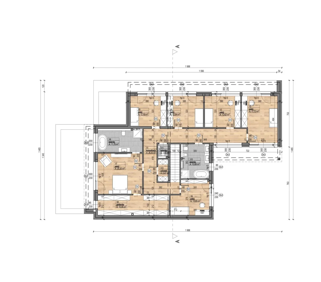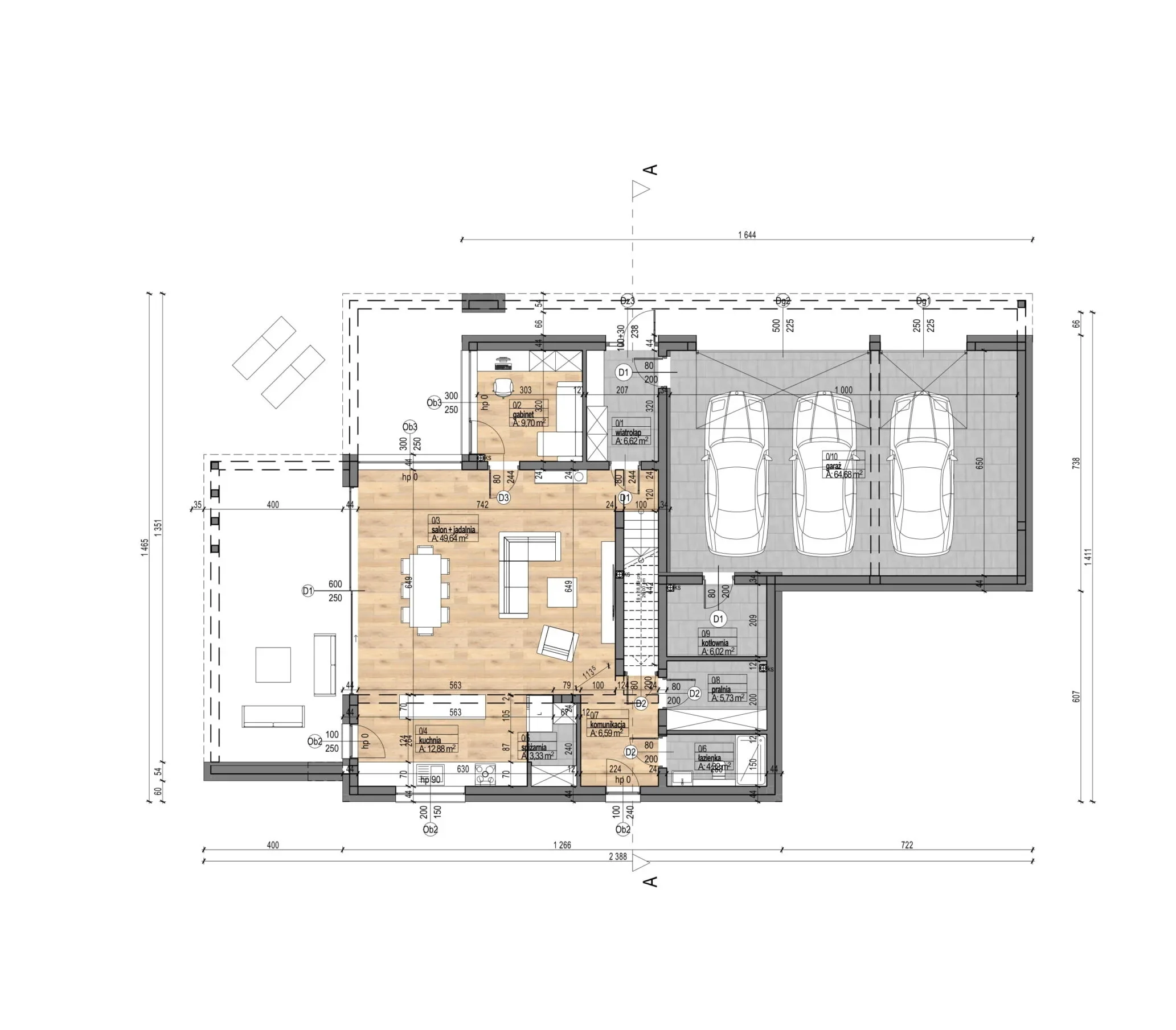 Im ersten Stock befindet sich ein geräumiges Wohnzimmer, das mit einem Esszimmer und einer offenen Küche kombiniert ist und einen idealen Ort bietet, um Zeit mit der Familie zu verbringen. Das Gebäude verfügt auch über zusätzliche Hauswirtschaftsräume, eine Garage für zwei Autos und große Terrassen, die sich perfekt zum Entspannen eignen. Im ersten Stock befinden sich Schlafzimmer und moderne Badezimmer für Komfort. Dank der durchdachten Raumaufteilung bietet das Haus eine große Funktionalität, die auch die Bedürfnisse der anspruchsvollsten Nutzer erfüllt. Das Projekt zeichnet sich durch seine Modernität und Liebe zum Detail aus, was es ideal für diejenigen macht, die ein elegantes und funktionales Zuhause für die ganze Familie suchen.