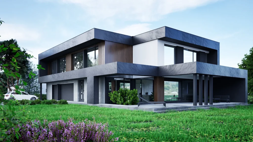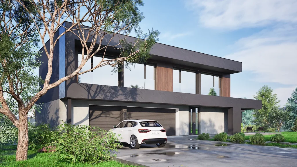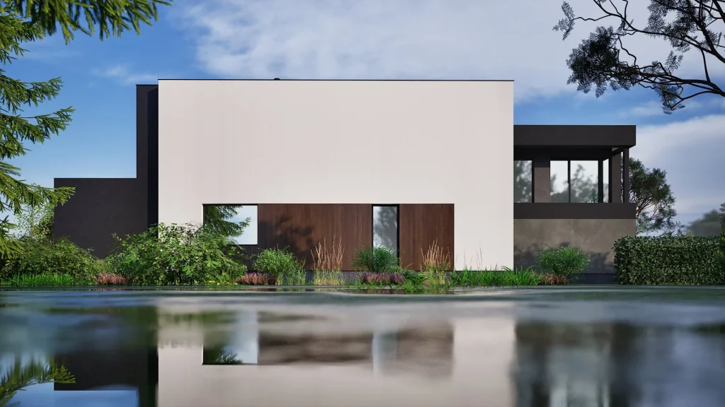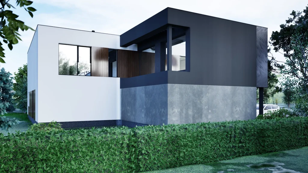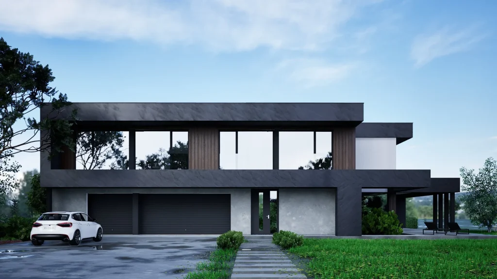 Das Design des Hauses stellt ein modernes, geräumiges Gebäude mit einfachen und eleganten Formen dar, das perfekt auf die Bedürfnisse moderner Familien zugeschnitten ist. Der zweistöckige Grundriss bietet weitläufige Innenräume mit großen Verglasungen, die für natürliches Licht und direkten Kontakt mit der Umgebung sorgen. Das Haus zeichnet sich durch einen minimalistischen, geometrischen Körper aus, in dem einfache Linien und eine Kombination aus dunklen und hellen Fassadenelementen dominieren. Die Verwendung moderner Materialien wie Strukturputz und Fassadenplatten verleiht dem Projekt einen einzigartigen Charakter und ein modernes Aussehen.