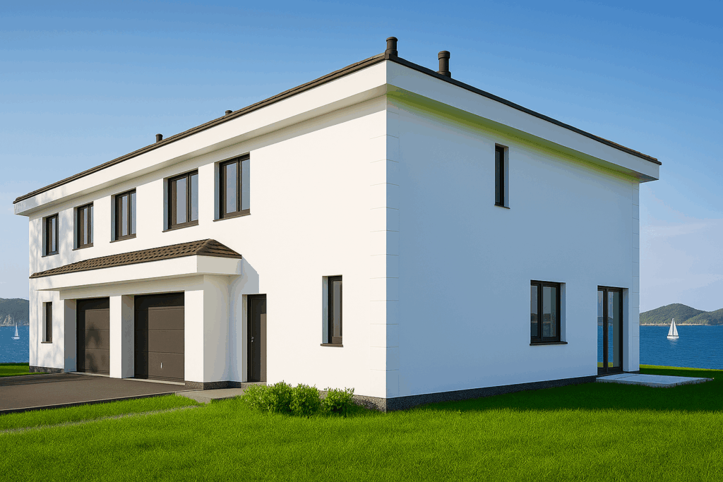 Zapovijedajući čistim modernim linijama i širokom morskom pozadinom, ova dvoetažna vila spaja oštru bijelu žbuku s antracitnim naglascima za trenutnu privlačnost rubnika.
