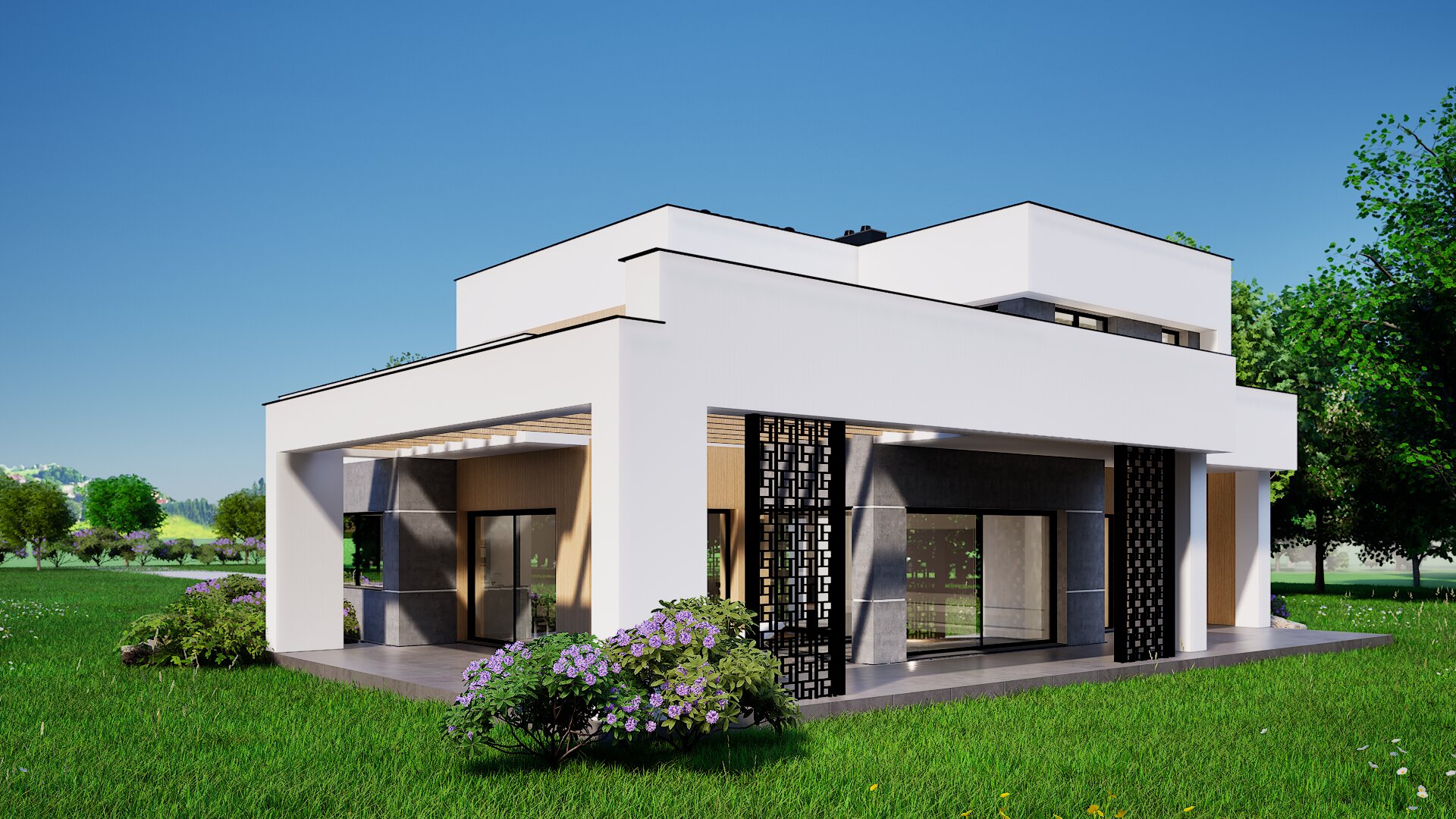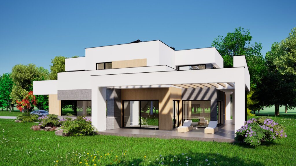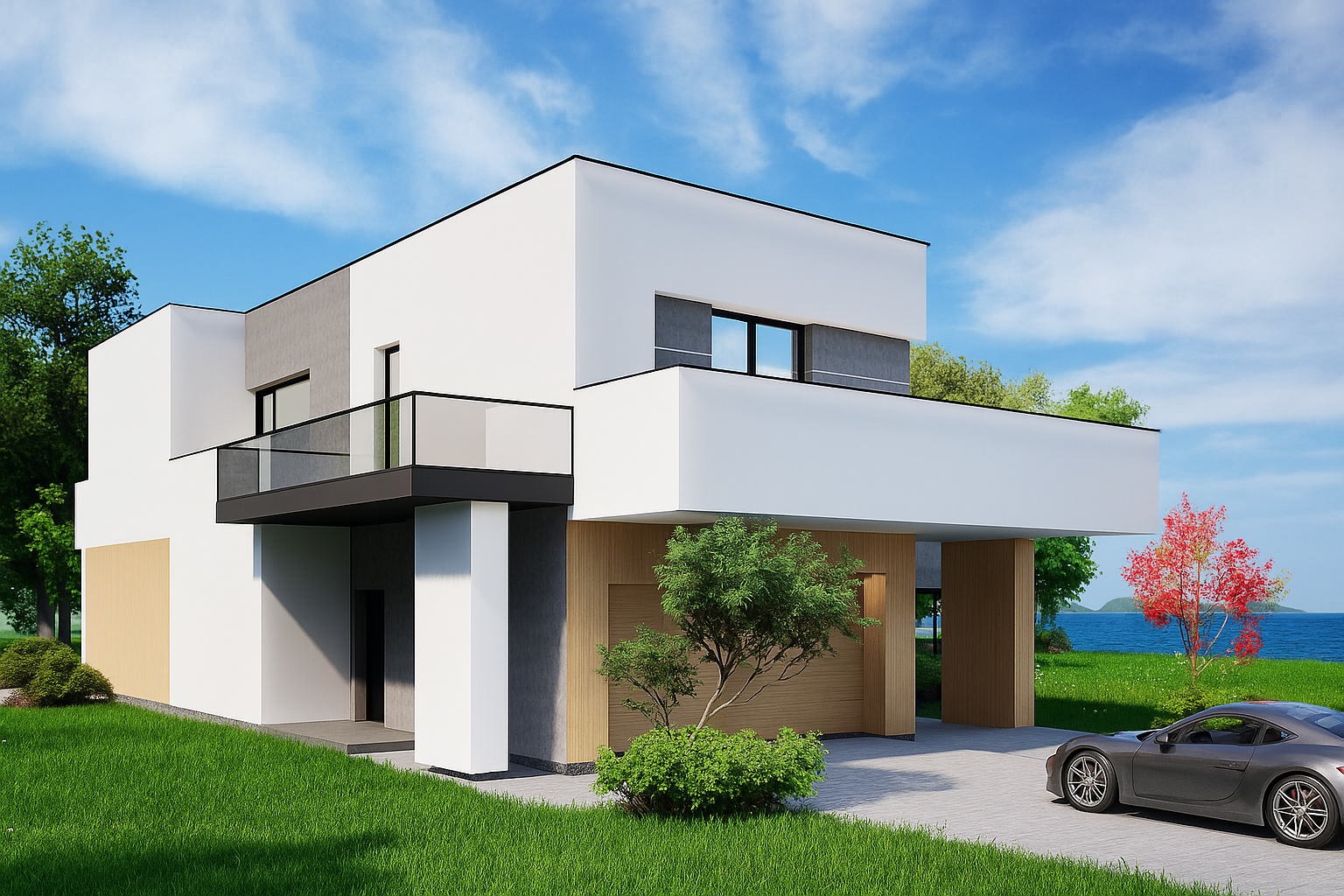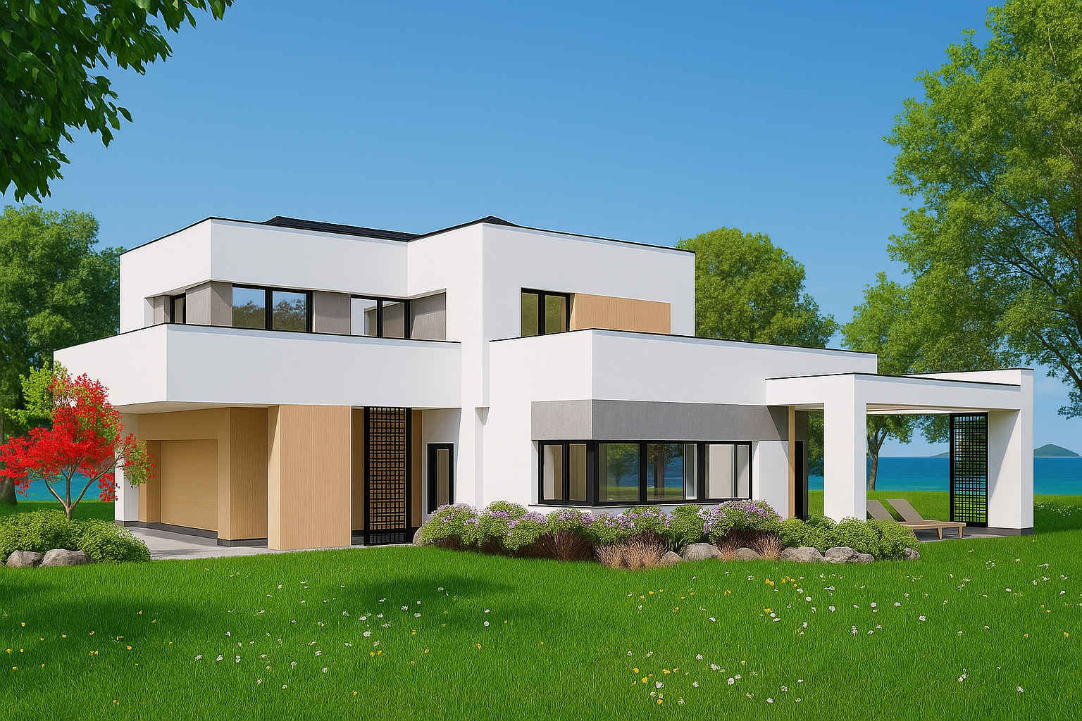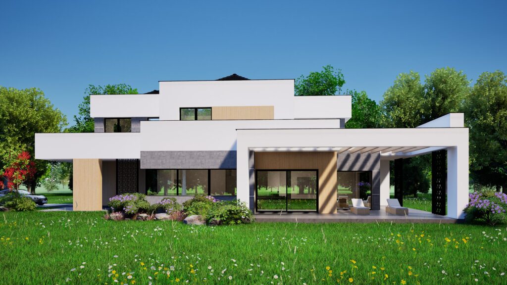 Smještena na njegovanoj parceli uz more, ova upečatljiva dvoetažna vila sastoji se od isprepletenih bijelih kubičnih volumena koji se hrabro nadvijaju nad bujnim vrtovima. Rafinirana mješavina oštre žbuke, toplih drvenih ploča i škriljevca-sivog arhitektonskog betona stvara dinamičnu teksturnu paletu, dok ekspanzivno ostakljenje briše granicu između interijera i krajolika. Omotane terase i okvir dnevnog boravka u sjeni pergole neprekinuti su pogled na ocean, a integrirana dvostruka garaža diskretno je skrivena iza okomitih drvenih obloga. Omotač visokih performansi, naglasci zelenog krova i pasivna solarna orijentacija naglašavaju predanost kuće suvremenom, održivom luksuzu.