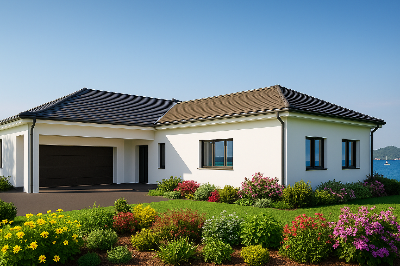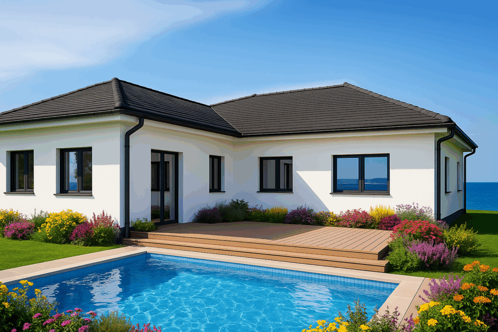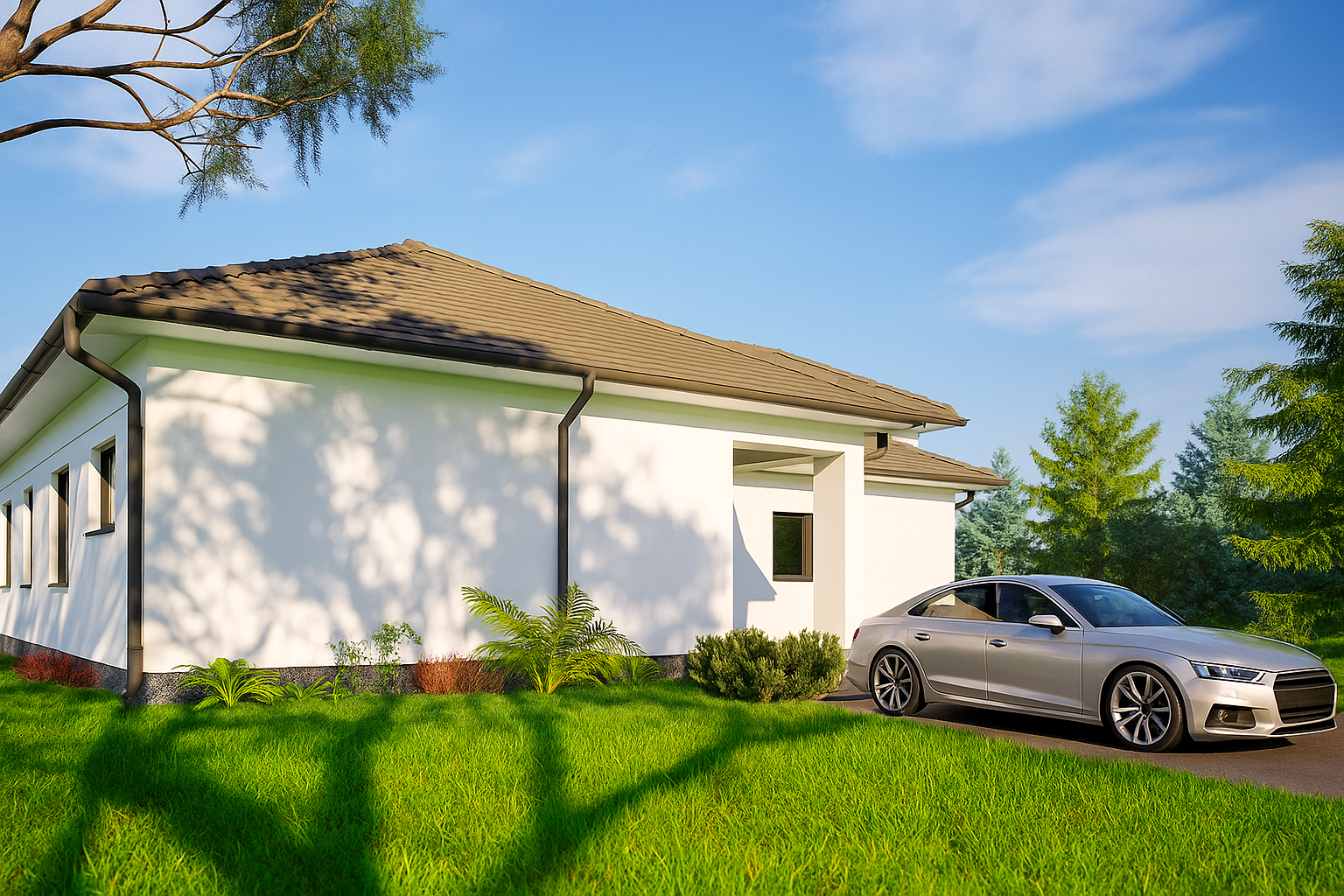 Priložena dvostruka garaža, diskretan servisni ulaz i promišljen raspored na jednoj razini (idealan za tri spavaće sobe) čine svakodnevni život jednostavnim.