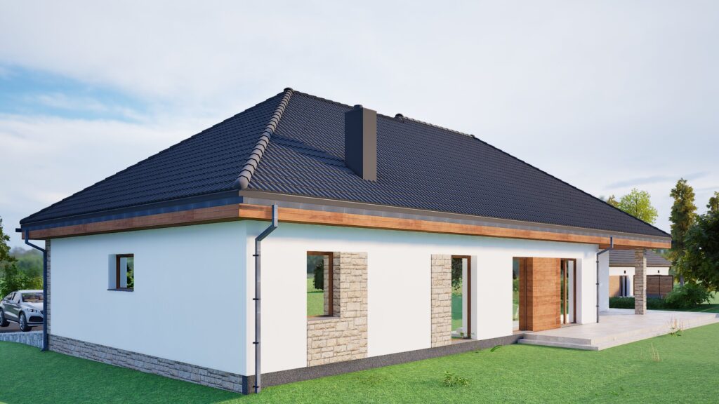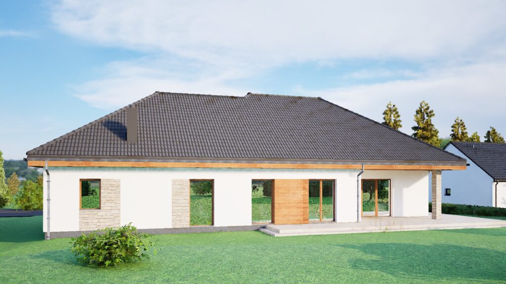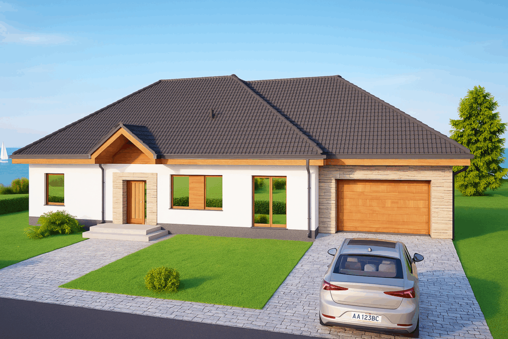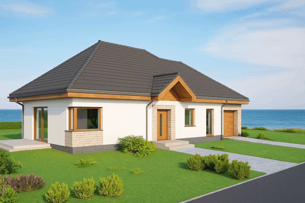 S pogledom na obalu, ova jednokatnica kombinira oštru bijelu žbuku s toplim drvenim detaljima i ručno položenim kamenim oblogama ispod tamnog krova obloženog crijepom. Veliki prozori i klizna staklena vrata preplavljuju unutrašnjost svjetlošću i otvaraju se na široku kamenu terasu koja obavija kuću. Ugodan trijem sa zabatom, integrirana pojedinačna garaža i široki prilaz osiguravaju svakodnevnu udobnost, dok zaštićena veranda s kamenim stupom poziva na objedovanje na otvorenom u svim godišnjim dobima. Prirodni materijali, energetski učinkovita konstrukcija i bezvremenske linije daju ovom bungalovu opušten, ali profinjen karakter.