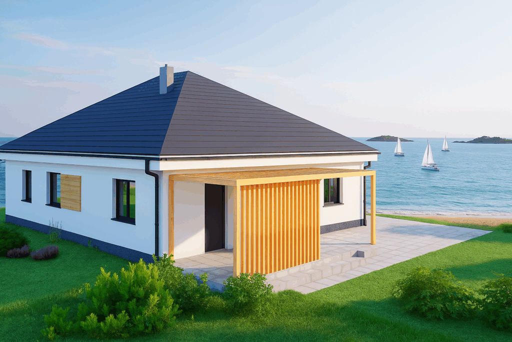 Smješten uz obalu, ovaj elegantni jednokatni dom spaja oštru bijelu žbuku s toplim drvenim detaljima ispod elegantnog krova od drvenog ugljena. Izdašni prozori uokviruju nesmetan pogled na more, dok duboka natkrivena terasa i nadstrešnica za automobil od drvenih letvica proširuju život na otvorenom. Uređeni vrt obuhvaća suncem okupanu terasu bazena, pružajući protok u zatvorenom i na otvorenom bez napora. Energetski učinkovita konstrukcija, čiste linije i prirodni materijali čine ovo nisko utočište modernim i gostoljubivim.