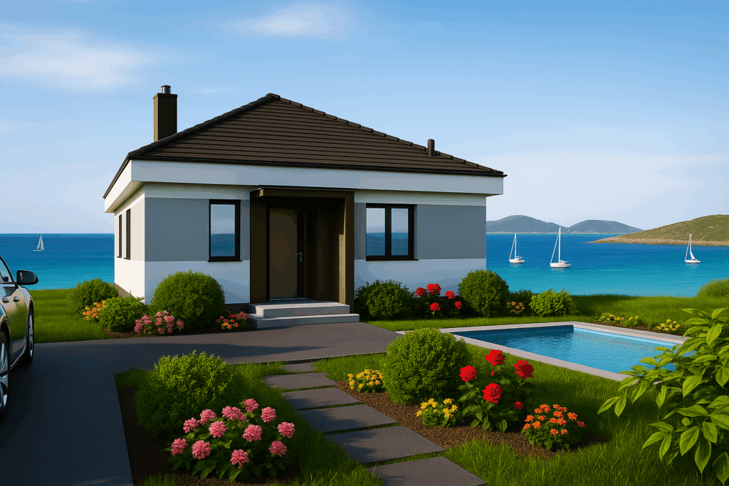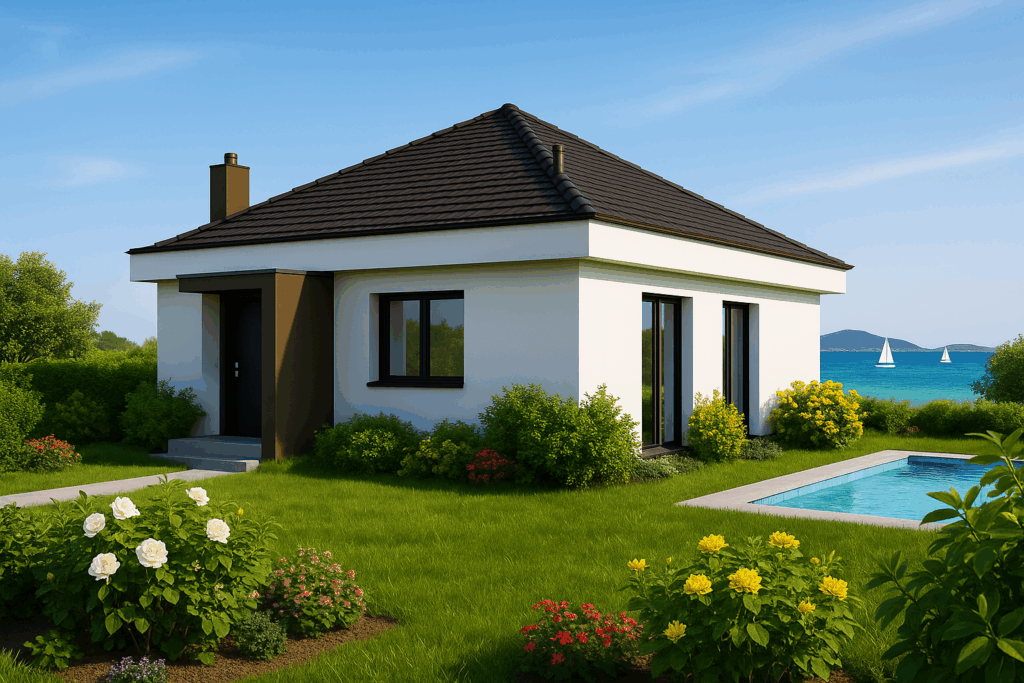 Oštra bijela fasada, antracit krovni crijep i crni aluminijski prozori stvaraju bezvremensku privlačnost rubnika, dok visoka izolacija i dvostruko staklo smanjuju račune za energiju.