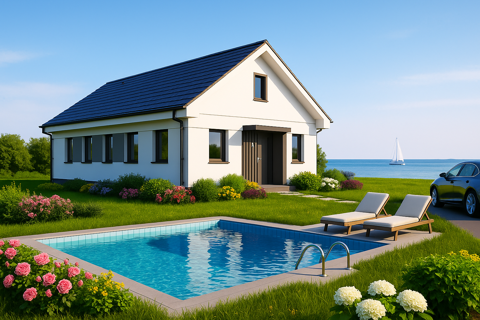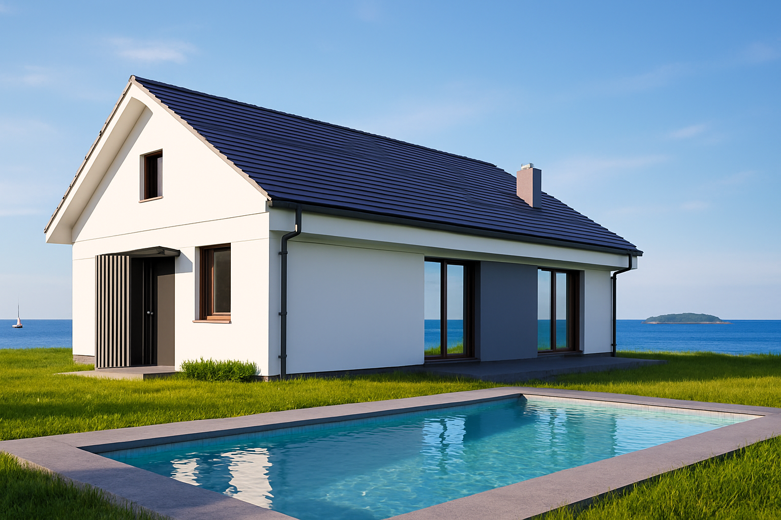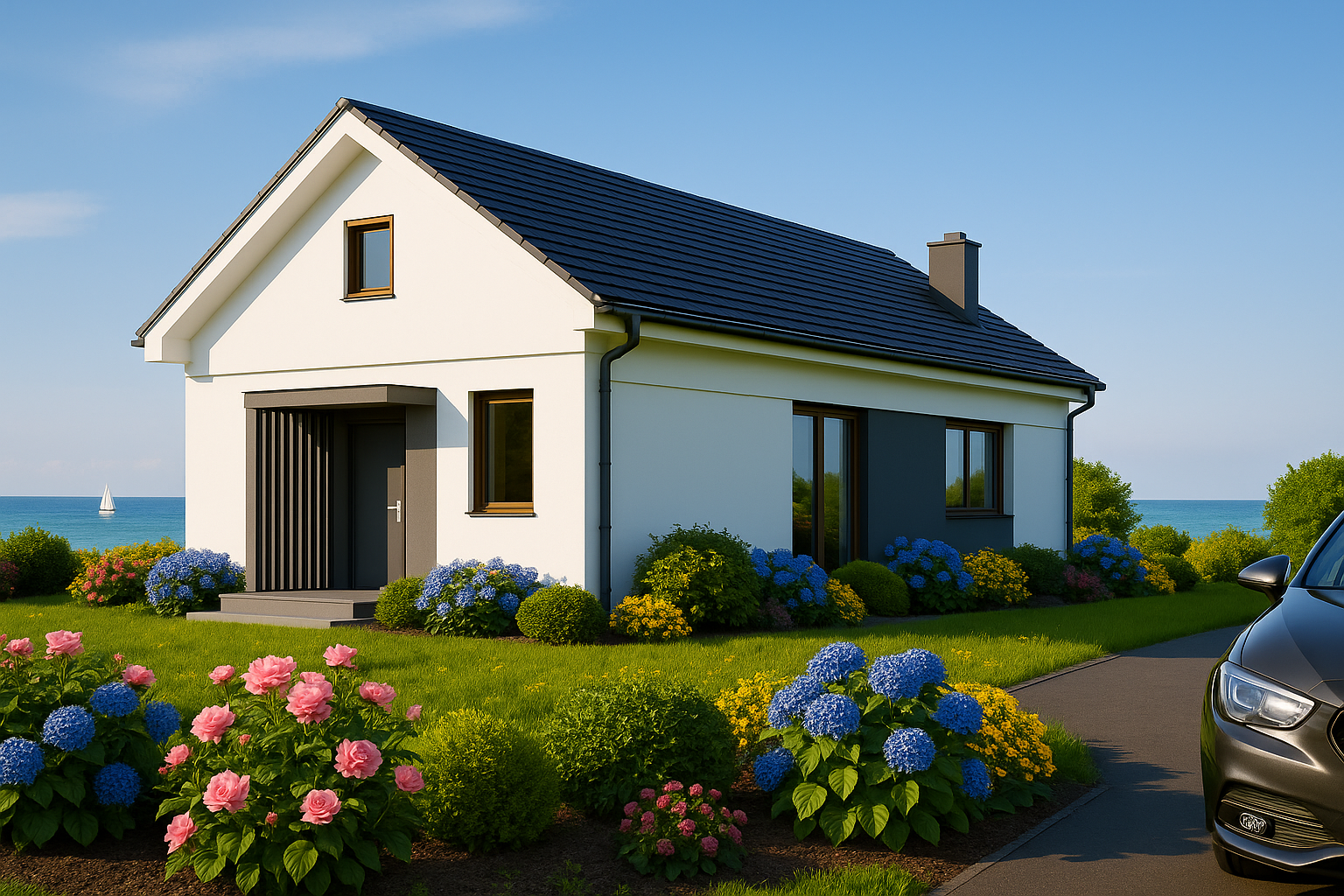 Oštra bijela žbuka, krov od crijepa od drvenog ugljena i široka klizna staklena vrata daju modernu privlačnost rubnika, dok šarene hortenzije i ruže uokviruju bujne vrtove koji ne zahtijevaju održavanje.